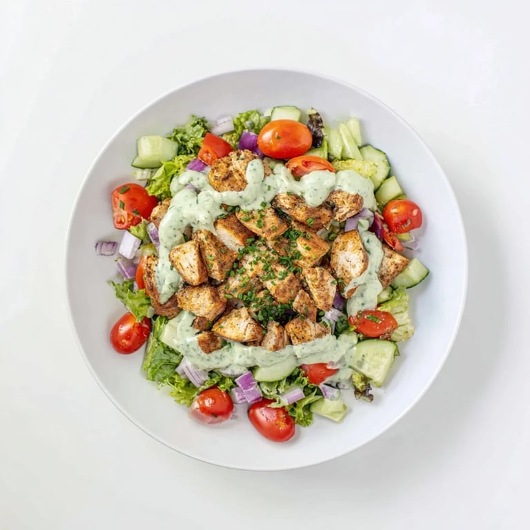 - Add the chicken to the bowl with the veggies and greens, pour the avocado ranch over everything, and toss gently with salad tongs. Serve it right away or let it chill for a bit if you like it cold.