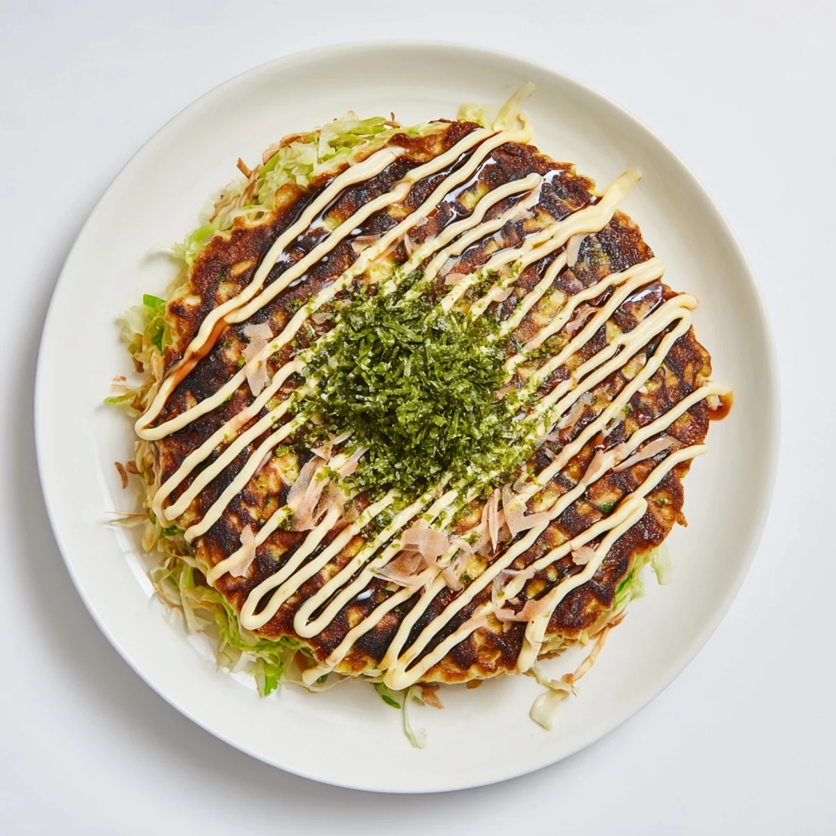 - Transfer each hot pancake to a plate and drizzle generously with okonomiyaki sauce and mayo in a zigzag pattern—this is where precision gives way to personality. Sprinkle the bonito flakes, aonori, and a few threads of pickled ginger on top while everything is still steaming.
