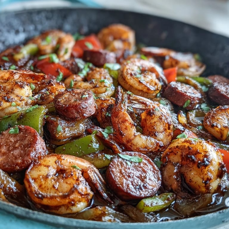 Save There's something about the sizzle of andouille sausage hitting hot oil that immediately signals dinner is happening fast. My kitchen filled with smoke one Tuesday evening when I threw together shrimp, sausage, and whatever peppers were still hanging around, and somehow it tasted like I'd planned it all week. The Cajun spices took over everything in the best way, transforming a simple skillet into something bold enough to make my family actually look up from their phones.
