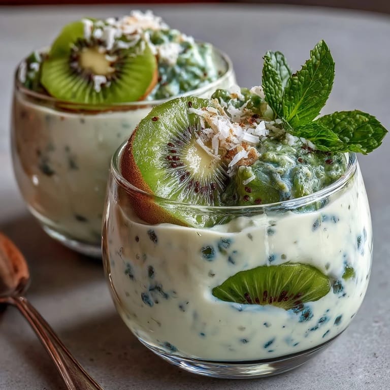 - Crown each cup with kiwi slices, a scatter of coconut flakes if you're using them, and a few mint leaves for brightness. Serve immediately from the fridge so every spoonful is cold and refreshing.