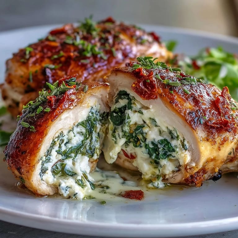 This dish loves simple sides that don't compete with it—roasted asparagus, buttered rice, or a crisp salad with lemon vinaigrette all work beautifully. You can also get creative with the filling itself, and I've had great success swapping goat cheese for feta if that's what's in your fridge, or adding a handful of chopped olives for extra brinyness. The sun-dried tomatoes are optional but make the plate look more interesting, which matters more than you'd think.