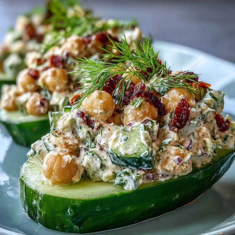 Save The humble chickpea transforms into something magical in this recipe. When mashed and seasoned with tangy ingredients like lemon juice, Dijon mustard, and dill, it creates a surprisingly seafood-like texture and flavor profile. The crisp cucumber boats not only make for elegant presentation but also add a hydrating crunch that complements the creamy filling perfectly.